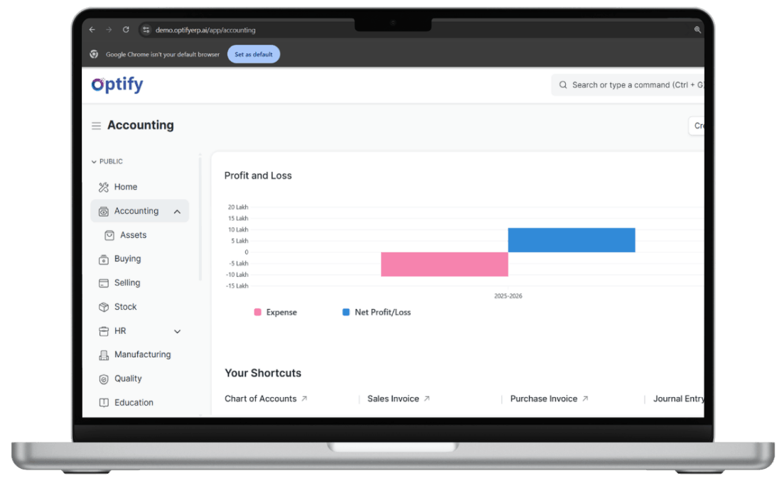 The system delivers real-time financial insights with a live Profit & Loss view, clear tracking of expenses versus profits, visual performance charts, quick access to accounting actions, and clean, decision-ready information for smarter business decisions.